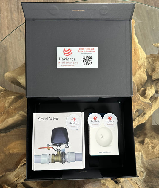 AquaSense Package - with zigbee hub. Cut off mains water supply when a water leak is detected. Contains Zigbee based motorised water valve and a water leak sensor. Works with HayMacs Aquasense, eWelink App, Smart Life